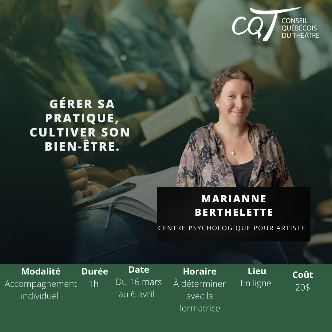 Nous intégrons également un volet « écoresponsabilité », en plus de maintenir les sessions de la formation « Gérer sa pratique, Cultiver son bien-être ». Cette approche favorise un équilibre sain entre performance et bien-être global pour les artistes et les travailleur·euses du théâtre.
